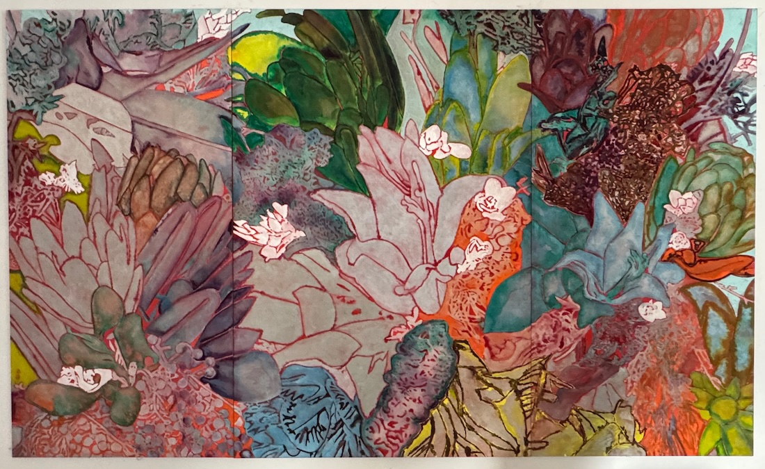 In Dark Water (2023), a suspended female figure seems to flow and overflow into water, reminding us of the intimate connection between the body and the ecosystem.