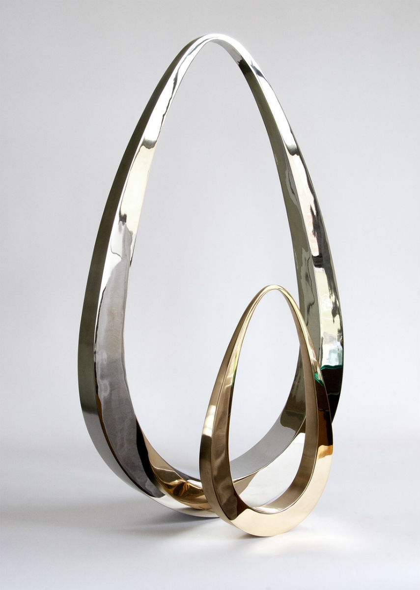 I love to see a ballerina balancing on her toes. When she dances, she creates kinetic energy all around her, composing shapes and forms as she gracefully moves. This conversation of static and kinetic movement is the inspiration for my sculpture. I see my sculpture as simple, gentle and graceful; when moved, it takes a life of its own. In Pendulum, the large stainless steel sculpture rocking with its smaller bronze pendulum creates its own magic—talking to each other, moving at different speeds, creating its own rhythm.
