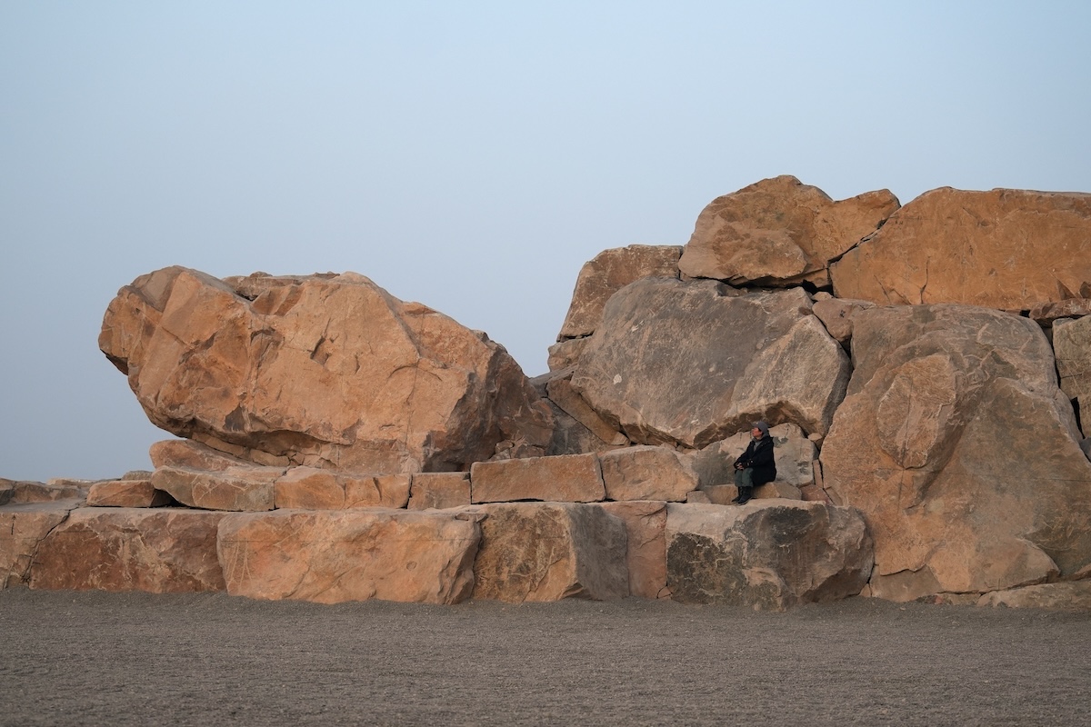 From the road, the work appears small. But when one stands before an eight meter high, fifteen meter wide, sixty nine meter long stone mountain, a deep sense of insignificance emerges. This disparity in scale breaks human arrogance and forces us to reconsider our position within the universe.
